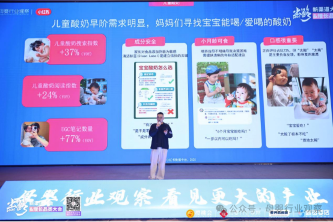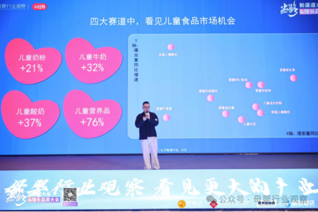 伴随母婴行业外部环境变化,儿童食品与奶粉作为关乎成长的重要品类,其消费逻辑与市场机会也在发生深刻演变。与此同时,在用户需求日益精细化与渠道竞争多维化的背景下,以内容社区为核心的新消费阵地,正成为洞察趋势、驱动增长的关键变量。4月9日,在母婴行业观察主办的2026新渠道大会&增长品类大会上,小红书商业快消母婴食品行业平台专家光明与小红书商业快消母婴食品行业CBD贝拉分别带来《新成长·新机会 儿童食品市场机会洞察》和《多选择·多收获 奶粉细分赛道洞察与种草新能力分享》主题分享,聚焦小红书儿童食品和奶粉两大赛道,深度拆解增长机会与种草方法论,以下为精彩演讲内容:
