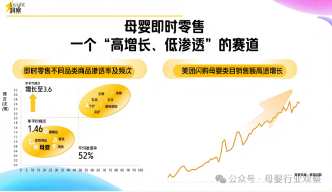 通过两组数据可以看到,左边是即时零售全品类的平均渗透率,为52%。而母婴品类其实远低于这个均值,仅做到了年平均频次1.46次/周,而其他成熟的品类可以做到3.6次/周,说明母婴还有很大的提升空间。右边数据显示,母婴类目的销售额正在快速增长,这也充分说明了母婴即时零售是一个高增长低渗透的潜力赛道。