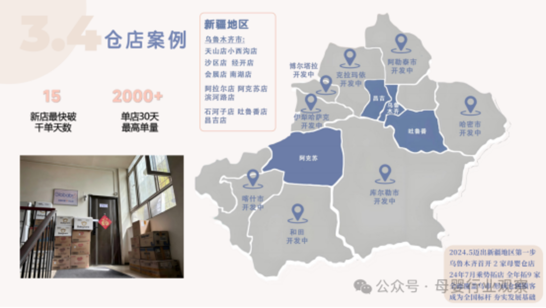 再从仓店案例来看,2024年5月我们迈出了新疆市场的第一步,先在乌鲁木齐开设了两家门店,开业后生意非常好。于是我们在24年7月乘势而上,继续拓店,全年迅速拓展了9家门店,全面覆盖乌鲁木齐市场,形成了紧密的仓网结构,牢牢锁住了客源,成为全国发展最好的区域之一。
